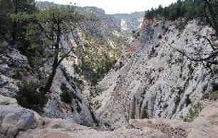 The trail starts at the West Rim trailhead from near Lava Point and traverses across the high alpine elevation with sweeping views out into the Wildcat Canyon area for the first 6.5 miles as you drop into Potato Hollow. Next the trail climbs out of Potato Hollow before it splits into the Telephone Canyon Trail and the West Rim Trail. The West Rim Trail follows along the rim with views of Phantom Valley and the canyons to the south. The Telephone Canyon Trail provides a shortcut between Potato Hollow and Cabin Spring or a possible loop for hikers entering and exiting the same trailhead. At Cabin Spring the trail begins a steep drop in elevation and descends 2,500 feet over 4.7 miles ending at the Grotto Picnic Area.