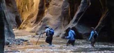 The Narrows is the narrowest section of Zion Canyon. This gorge, with walls a thousand feet tall and the river sometimes just twenty to thirty feet wide, is one of the most popular areas in Zion National Park. Most will hike up and back and will see the best views by hiking 3 miles to Wall Street. You start at the last shuttle stop and hiking along the paved, wheelchair accessible Riverside Walk for one mile from the Temple of Sinawava shuttle stop. If you wish to see more, you must walk in the Virgin River. This can involve wading upstream for just a few minutes or it can be an all day hike. Some of our elite hikers will take on the 16 mile Top to Bottom hike (10 to 14 hrs) from Chamberlain's Ranch outside the park and ending where the Bottom Up hikers started.